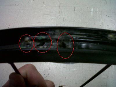 13. I have been involved in and around bike shops for the last 7 years and have seen alot of thing from dumb to strange but this, this is a first, see pics. It seems the sealent has eaten away the matel of the rims resulting in it looking like swiss cheese and it's on both the front and rear wheel and not just on one spot on the rim, it seems everywhere where the black coating is scratched its started to eat away at the rim from the inside What's your opinion? My theory is either the client cleaned hs rims with some volatile solvent or corrosive liguid of sorts or he made some odd mix of home brew sealent and it caused one huge chemical reaction almost like it became corrosive?