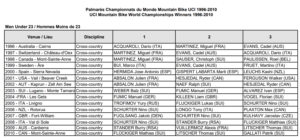 17. 1. I need to find a webpage with the results in a table. 2. What I have found stops at 2010, and includes a number of names on the Elite list. 3. I knew Burry won the U23, but I didn't know he was 2nd the year before (or I forgot).